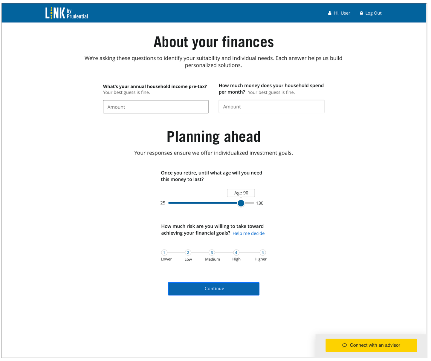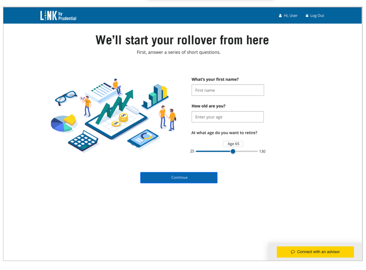 LINK by Prudential was an award-winning robo-advisor. We consistently iterated to keep the investing experience simple. Here's our "express path" 401K rollover registration flow.